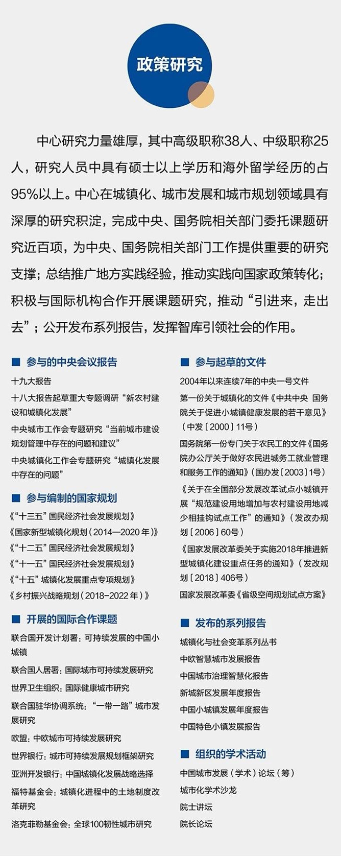 中國(guó)城市和小城鎮(zhèn)改革發(fā)展中心,成立于1998年,主要承擔(dān)城鎮(zhèn)化、城市發(fā)展、城鄉(xiāng)融合及相關(guān)領(lǐng)域的政策研究和決策咨詢工作,為中央、國(guó)務(wù)院相關(guān)政策文件制定和規(guī)劃編制提供研究支撐,為全國(guó)城市和小城鎮(zhèn)發(fā)展提供政策咨詢服務(wù),為全國(guó)城市和小城鎮(zhèn)發(fā)展編制各類規(guī)劃,為城市間國(guó)際合作、智慧城市建設(shè)、城鎮(zhèn)化新媒體宣傳推廣、文化體育交流、城市多樣化融資搭建專門平臺(tái),是專注于城鎮(zhèn)化、城市發(fā)展和城市規(guī)劃問題的高端智庫。